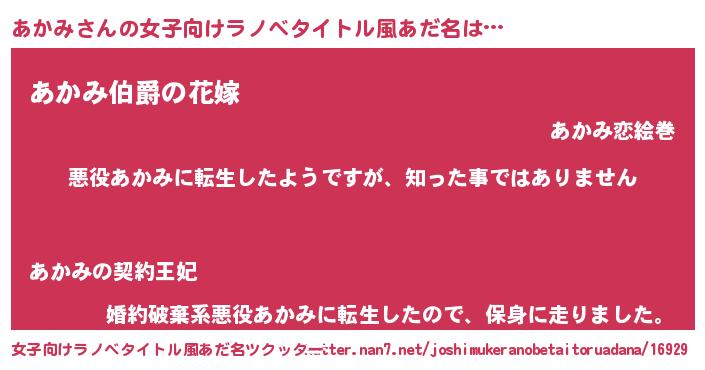 | 男性向けラノベタイトル風あだ名 | 『この素晴らしい世界にあかみを!』 |