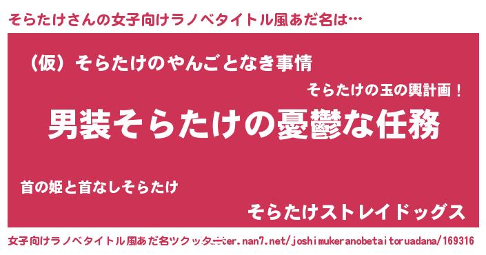 | 男性向けラノベタイトル風あだ名 | 『うちのそらたけが世界を掌握している!』 |