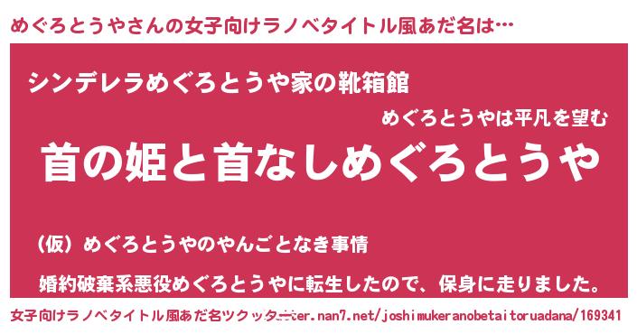 | 男性向けラノベタイトル風あだ名 | 『はたらくめぐろとうやさま!』 |