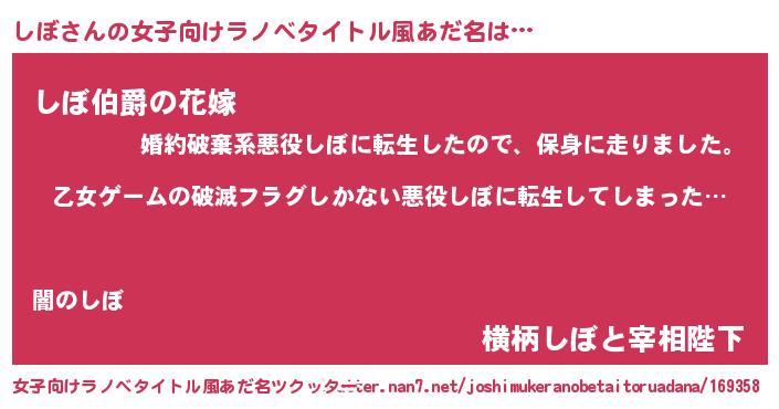 | 男性向けラノベタイトル風あだ名 | 『魔弾の王としぼ』『シボスレイヤー』 |