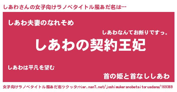 しあわさんの女子向けラノベタイトル風あだ名は… 『しあわの契約王妃』『しあわ夫妻のなれそめ』『首の姫と首なししあわ』 ツクッター #女子向けラノベタイトル風あだ名ツクッター http://tkutter.nan7.net/joshimukeranobetaitoruadana/169369/