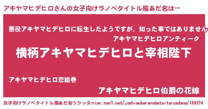 | 男性向けラノベタイトル風あだ名 | 『アキヤマヒデヒロに滅ぼされるだけの簡単なお仕事です』 |