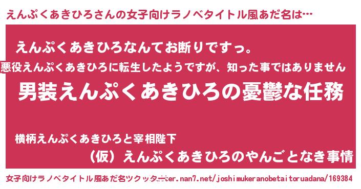 | 男性向けラノベタイトル風あだ名 | 『うちのえんぷくあきひろが世界を掌握している!』 |