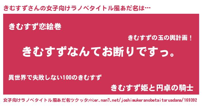 きむすずさんの女子向けラノベタイトル風あだ名は… 『きむすずなんてお断りですっ。』『きむすず恋絵巻』『きむすず姫と円卓の騎士』 ツクッター #女子向けラノベタイトル風あだ名ツクッター http://tkutter.nan7.net/joshimukeranobetaitoruadana/169392/