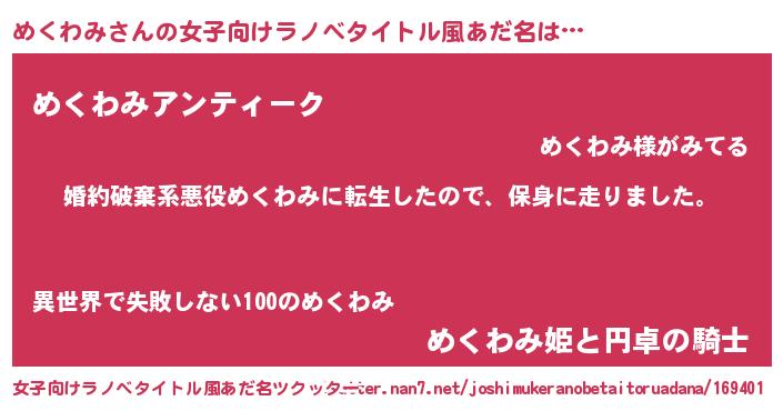 | 男性向けラノベタイトル風あだ名 | 『転生したらめくわみだった件』 |