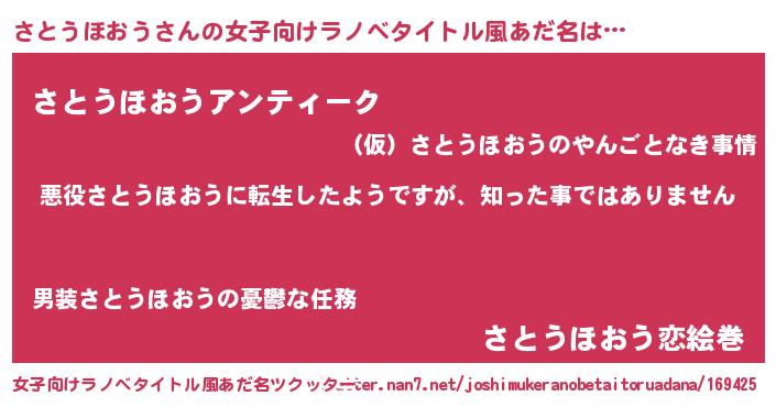 | 男性向けラノベタイトル風あだ名 | 『この素晴らしい世界にさとうほおうを!』 |