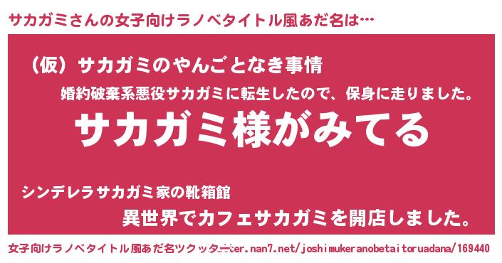 | 男性向けラノベタイトル風あだ名 | 『サカガミの嫁は女の子じゃないと思った?』 |