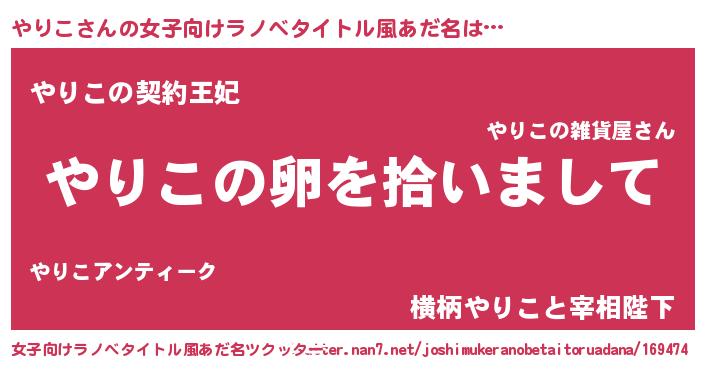 | 男性向けラノベタイトル風あだ名 | 『やりこの嫁は女の子じゃないと思った?』 |
