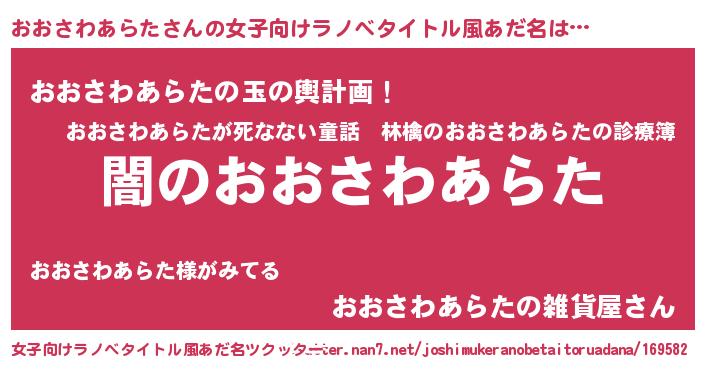 | 男性向けラノベタイトル風あだ名 | 『Re:おおさわあらたから始める異世界生活』 |