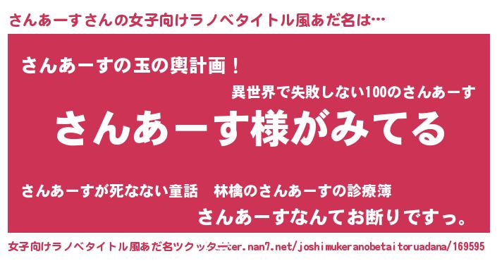 | 男性向けラノベタイトル風あだ名 | 『さんあーすの嫁は女の子じゃないと思った?』 |