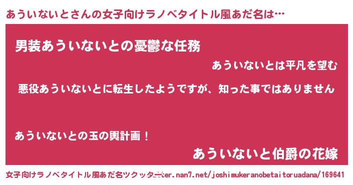 | 男性向けラノベタイトル風あだ名 | 『この素晴らしい世界にあういないとを!』 |