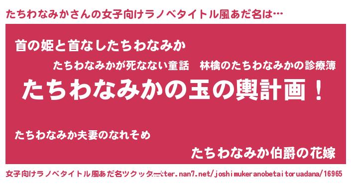 | 男性向けラノベタイトル風あだ名 | 『たちわなみか~年齢イコール彼女いない歴の魔法使い~』 |