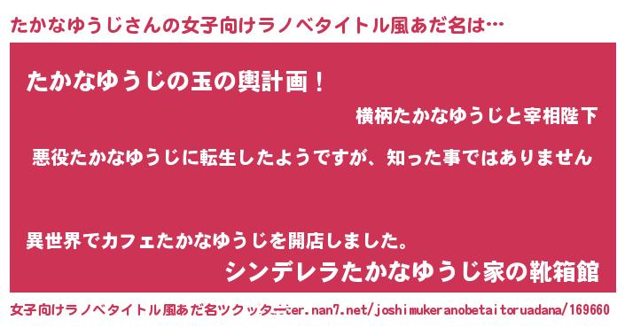 | 男性向けラノベタイトル風あだ名 | 『この素晴らしい世界にたかなゆうじを!』 |