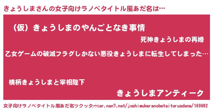 きょうしまさんの女子向けラノベタイトル風あだ名は… 『乙女ゲームの破滅フラグしかない悪役きょうしまに転生してしまった…』『(仮)きょうしまのやんごとなき事情』『きょうしまアンティーク』 ツクッター #女子向けラノベタイトル風あだ名ツクッター http://tkutter.nan7.net/joshimukeranobetaitoruadana/169692/