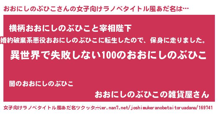 | 男性向けラノベタイトル風あだ名 | 『おおにしのぶひこという概念が存在しない退屈な世界 』 |