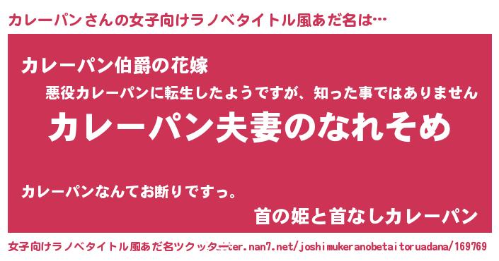 | 男性向けラノベタイトル風あだ名 | 『おまえをオタクにしてやるから、俺をカレーパンにしてくれ! 』 |