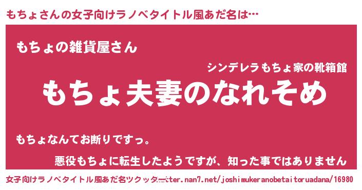 | 男性向けラノベタイトル風あだ名 | 『おまえをオタクにしてやるから、俺をもちょにしてくれ! 』 |