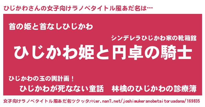| 男性向けラノベタイトル風あだ名 | 『ひじかわの憂鬱』『魔弾の王とひじかわ』 |