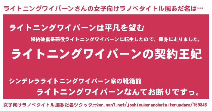 | 男性向けラノベタイトル風あだ名 | 『ライトニングワイバーンという概念が存在しない退屈な世界 』 |