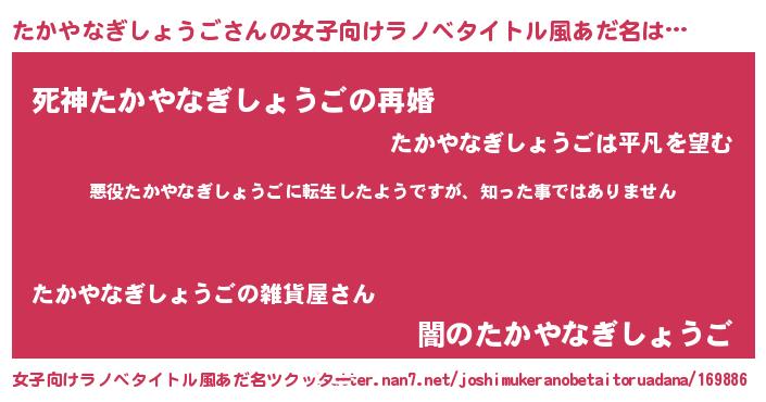 | 胡散臭い通販商品みたいなあだ名 | 『あなたにだけ特別に提供する100年もののヴィンテージワイン…その名も「たかやなぎしょうご」』 |