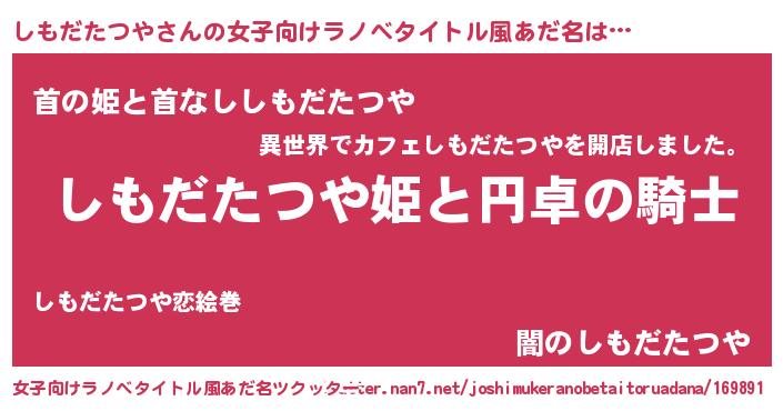 | 男性向けラノベタイトル風あだ名 | 『しもだたつやの憂鬱』 |