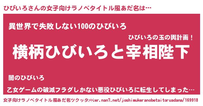 | 男性向けラノベタイトル風あだ名 | 『ひびいろに滅ぼされるだけの簡単なお仕事です』 |