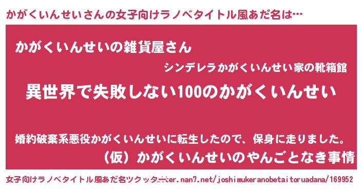 | 男性向けラノベタイトル風あだ名 | 『かがくいんせいという概念が存在しない退屈な世界 』 |
