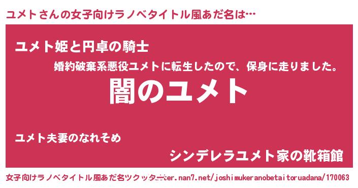 ユメトさんの女子向けラノベタイトル風あだ名は… 『闇のユメト』『ユメト姫と円卓の騎士』『シンデレラユメト家の靴箱館』 ツクッター #女子向けラノベタイトル風あだ名ツクッター http://tkutter.nan7.net/joshimukeranobetaitoruadana/170063/