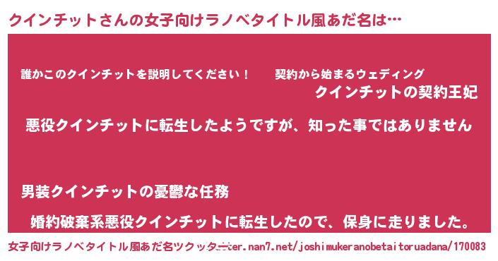 | 男性向けラノベタイトル風あだ名 | 『この素晴らしい世界にクインチットを!』 |