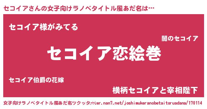 | 男性向けラノベタイトル風あだ名 | 『おまえをオタクにしてやるから、俺をセコイアにしてくれ! 』 |