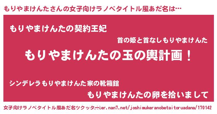 | 男性向けラノベタイトル風あだ名 | 『もりやまけんた~年齢イコール彼女いない歴の魔法使い~』 |