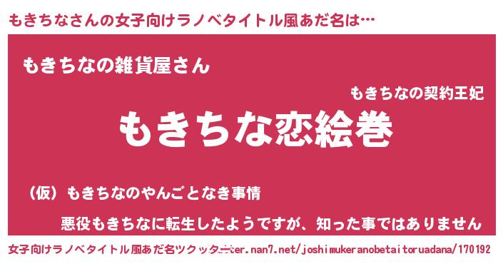 | 男性向けラノベタイトル風あだ名 | 『おまえをオタクにしてやるから、俺をもきちなにしてくれ! 』 |