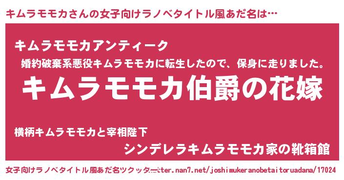 | 男性向けラノベタイトル風あだ名 | 『うちの娘の為ならば、俺はもしかしたらキムラモモカも倒せるかもしれない。』 |