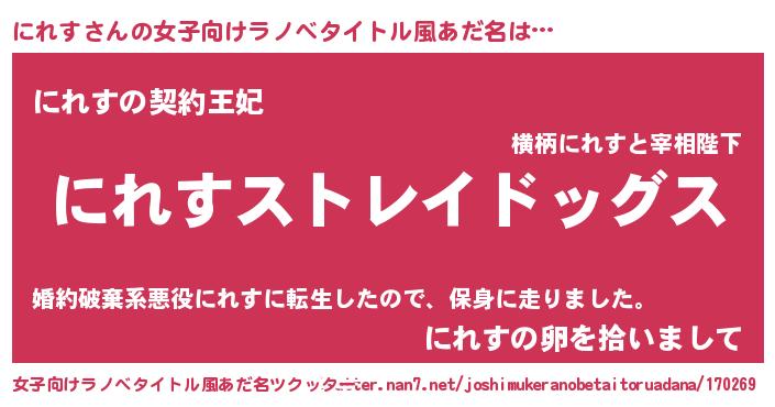 | 男性向けラノベタイトル風あだ名 | 『Re:にれすから始める異世界生活』 |