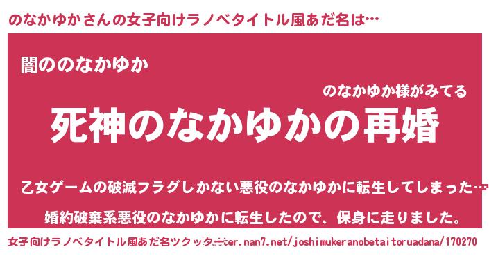 | 男性向けラノベタイトル風あだ名 | 『ノーゲーム・ノーノナカユカ』 |