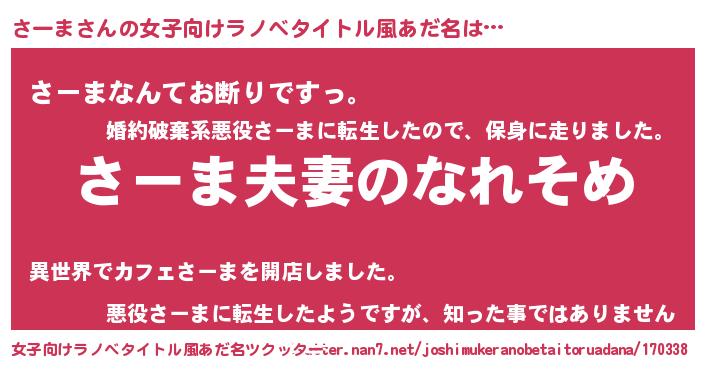 | 男性向けラノベタイトル風あだ名 | 『おまえをオタクにしてやるから、俺をさーまにしてくれ! 』 |