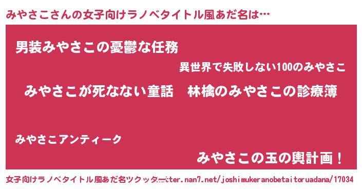| 男性向けラノベタイトル風あだ名 | 『魔弾の王とみやさこ』 |