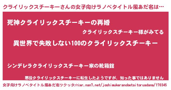 | 男性向けラノベタイトル風あだ名 | 『クライリックスチーキーという概念が存在しない退屈な世界 』 |