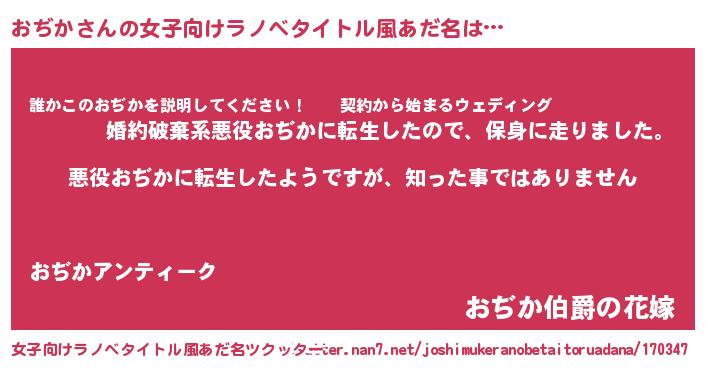 | 男性向けラノベタイトル風あだ名 | 『この素晴らしい世界におぢかを!』 |