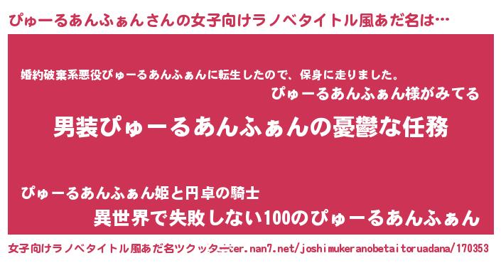 | 胡散臭い通販商品みたいなあだ名 | 『来世でも幸せになれる水素水…その名も「ぴゅーるあんふぁん」』 |