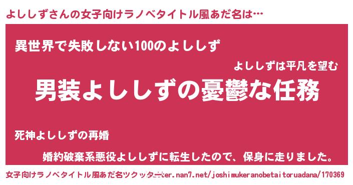 | 男性向けラノベタイトル風あだ名 | 『うちのよししずが世界を掌握している!』 |