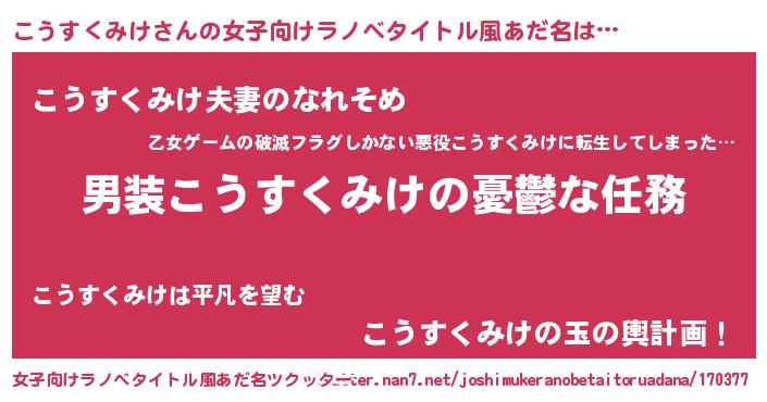 | 男性向けラノベタイトル風あだ名 | 『冴えないこうすくみけの育てかた』 |