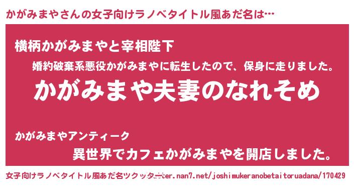 | 男性向けラノベタイトル風あだ名 | 『おまえをオタクにしてやるから、俺をかがみまやにしてくれ! 』 |
