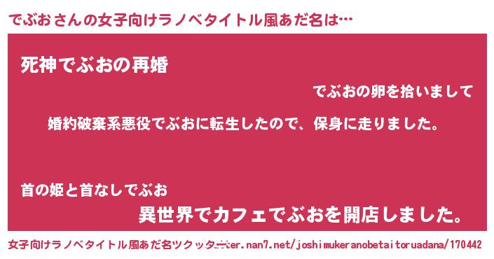 | 男性向けラノベタイトル風あだ名 | 『転生したらでぶおだった件』 |