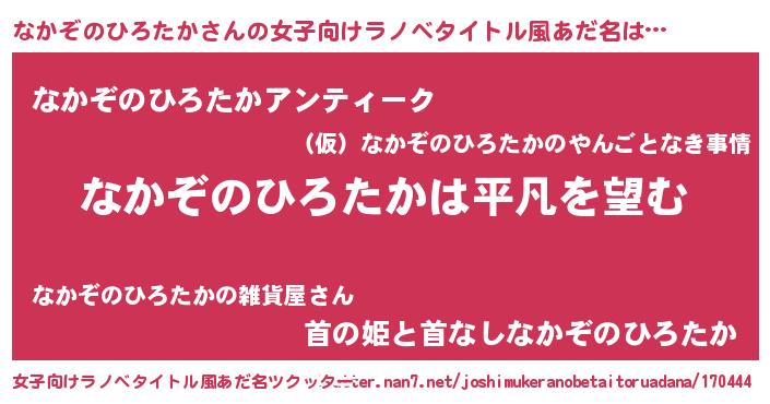 | 胡散臭い通販商品みたいなあだ名 | 『信頼と実績のサプリメント…その名も「なかぞのひろたか」』 |