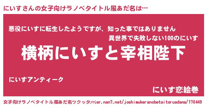 | 男性向けラノベタイトル風あだ名 | 『にいすに滅ぼされるだけの簡単なお仕事です』 |