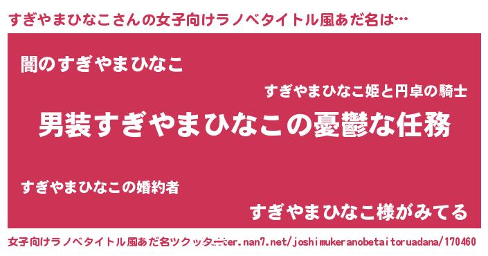 | 男性向けラノベタイトル風あだ名 | 『うちのすぎやまひなこが世界を掌握している!』 |