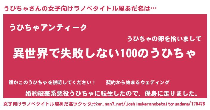 | 男性向けラノベタイトル風あだ名 | 『うひちゃという概念が存在しない退屈な世界 』 |