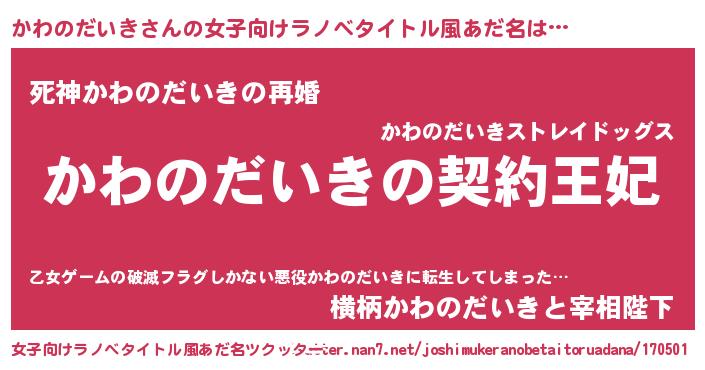 | 男性向けラノベタイトル風あだ名 | 『誰もが恐れるあのかわのだいきが、ぼくの専属メイドになるようです。』 |