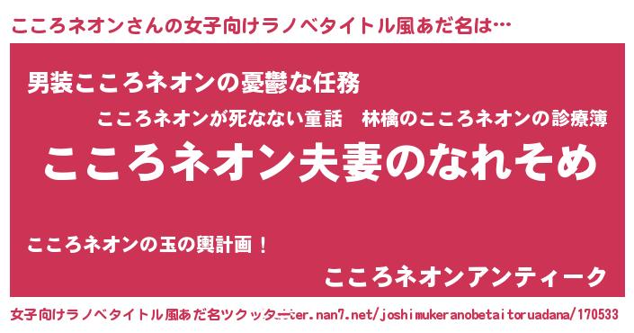 | 男性向けラノベタイトル風あだ名 | 『おまえをオタクにしてやるから、俺をこころネオンにしてくれ! 』 |